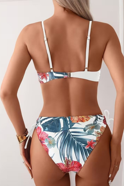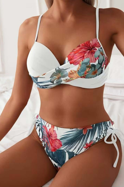 Ženski dvodelni kupaći kostim 26999 donosi kombinaciju ženstvenog kroja i živopisnog letnjeg dezena. Bela podloga sa šarenim cvetovima i listovima daje modelu vedar i svež izgled koji privlači pažnju i savršeno se uklapa u atmosferu mora, sunca i odmora.