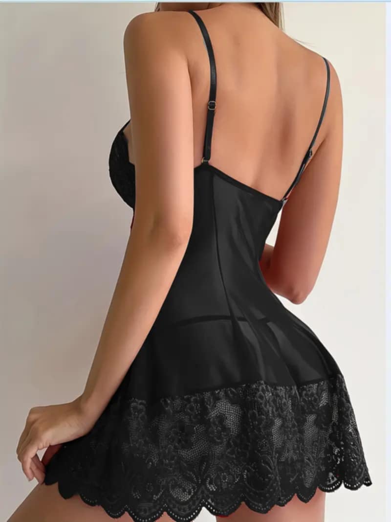 Spavaćica je izrađena od prozračnog tila i fine čipke, savršeno osmišljena za tople letnje večeri. Podesive bretele omogućavaju da je prilagodite vašem telu, dok trouglasti deo od čipke preko grudi pruža decentnu pokrivenost i atraktivan izgled. Donji deo podseća na čipkastu mini suknju, lagano leprša oko tela i stvara romantičan utisak.