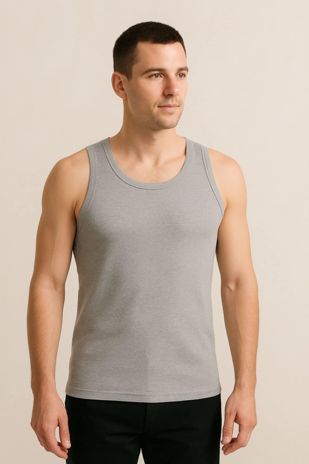 Klasičan kroj bez rukava, sa širim bretelama i okruglim izrezom, obezbeđuje slobodu pokreta i odličnu funkcionalnost. Zahvaljujući neutralnim i praktičnim bojama – crnoj, beloj i svetlo sivoj – ova potkošulja lako se uklapa u različite stilove i kombinacije. Može se nositi kao osnovni sloj ispod košulje, sakoa ili džempera, ali i samostalno u toplim letnjim danima.