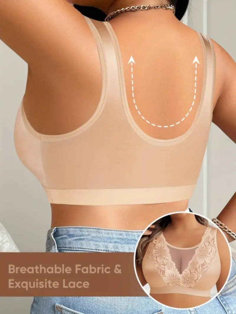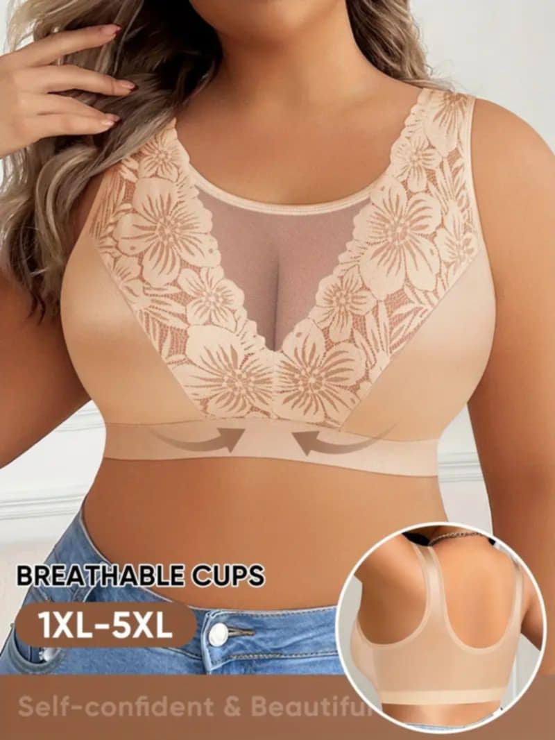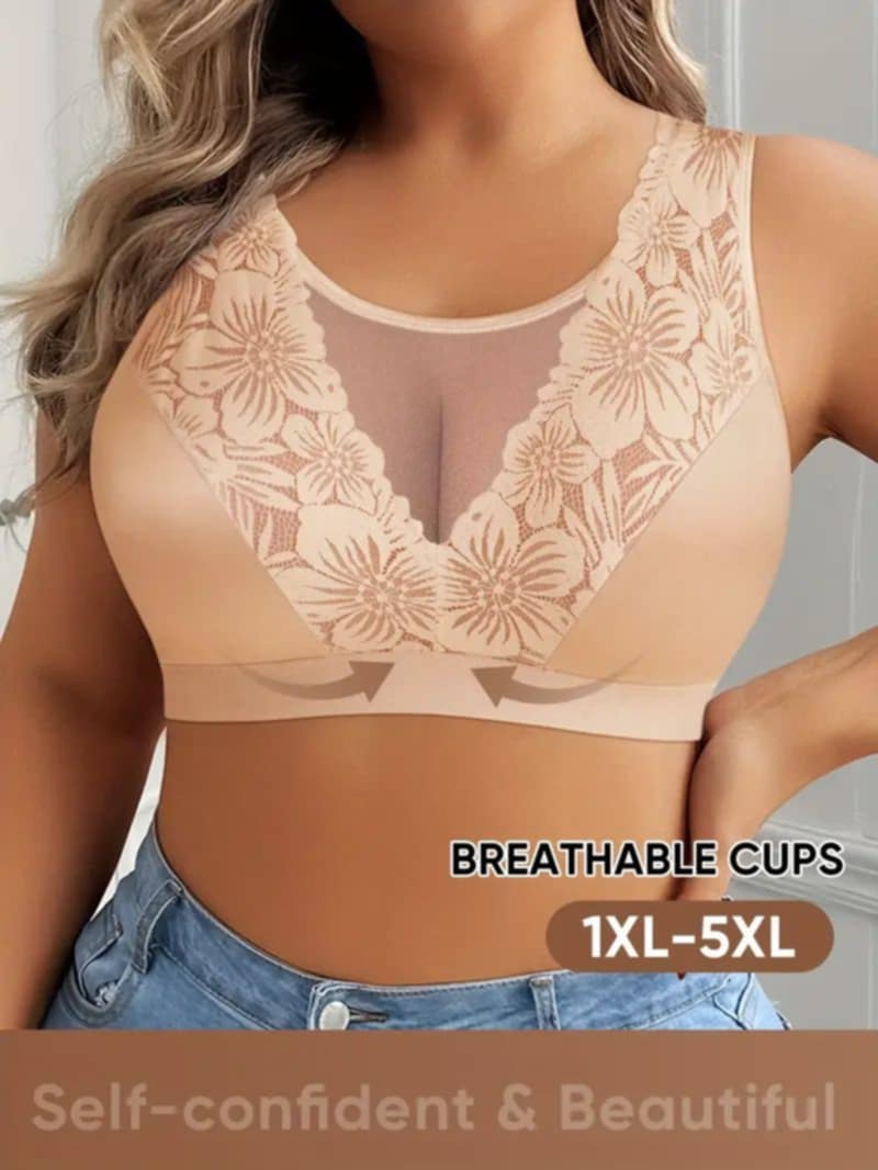 V-izrez ukrašen tilom između korpi i dekorativna čipka sa floralnim motivima daju grudnjaku nežan, ali moderan izgled. Iako je prvenstveno kreiran za udobnost, svojim elegantnim dizajnom omogućava da se osećate samouvereno i ženstveno tokom celog dana.