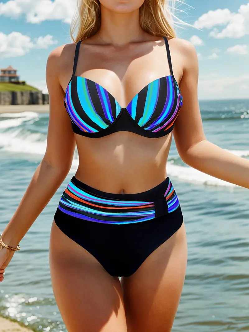 Unesite dašak stila u vašu kolekciju plažne odeće s dvodelnim kupaćim kostimom model 241003, dostupnim u veličini XXL. Ovaj kupaći kostim, u atraktivnoj kombinaciji plave i žute boje sa prugama, savršeno ističe vašu preplanulu kožu i donosi moderan izgled koji će vas izdvojiti na plaži ili pored bazena.