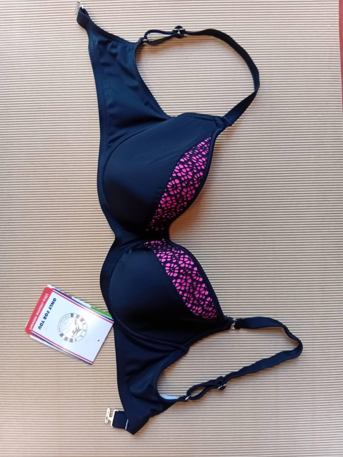 Crna osnova daje eleganciju, dok živi akcenti u zelenoj, rozoj i narandžastoj unose dozu razigranosti i modernog stila. Grudnjak je ojačan žicom i pažljivo oblikovan kako bi pružio maksimalan osećaj sigurnosti bez zatezanja ili neprijatnosti, dok podesive bretele i klasično kopčanje omogućavaju individualno prilagođavanje.