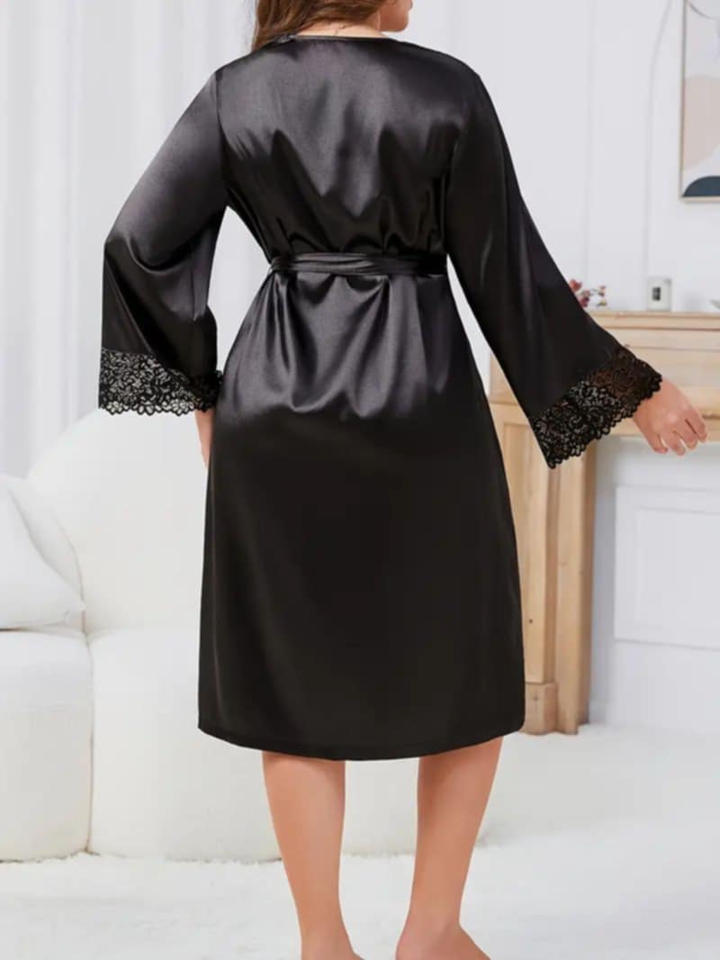 Crna boja simbolizuje klasiku i moć, dok duboki V izrez sa nežnom čipkom otkriva taman onoliko koliko treba da se osećate ženstveno i samouvereno. Saten nežno prati liniju tela, dok pojas u struku oblikuje siluetu po vašoj meri. Čipkasti završeci na rukavima donose dodatnu notu luksuza i pažljivo osmišljen detalj koji pleni.
