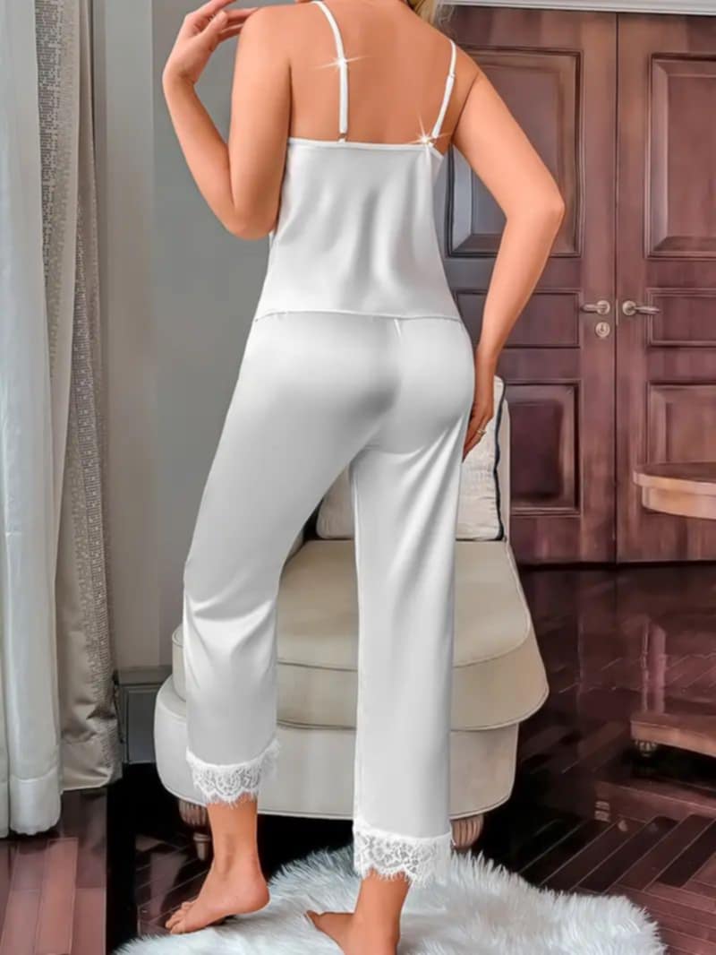 Gornji deo čini majica na tanke, podesive bretele, ukrašena V-izrezom i diskretnom čipkom koja nežno ističe dekolte. Lagani saten prijatno obavija telo, ostavljajući osećaj luksuznog dodira i profinjenosti.