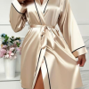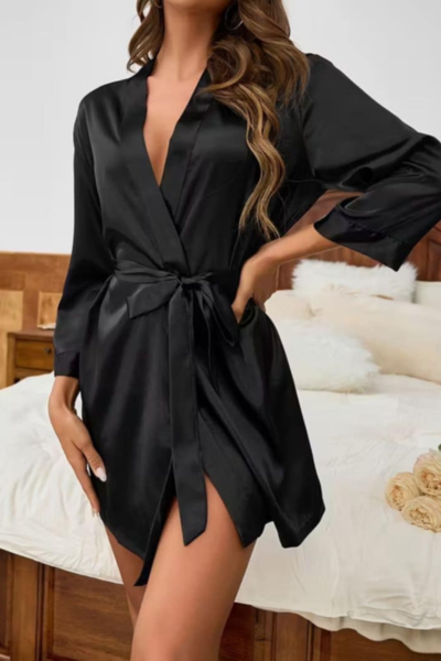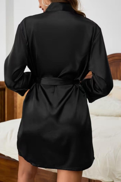 Izrađen od finog, mekanog satena, ogrtač nežno klizi po koži i pruža osećaj luksuznog dodira. Vezuje se u struku, omogućavajući prilagođavanje obliku tela i diskretno naglašavanje figure. Kratki kroj dodaje praktičnost i slobodu pokreta, čineći ga idealnim za jutarnje rituale, opuštajuće večeri ili romantične trenutke.